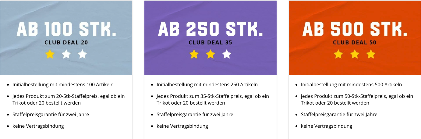 Vereine sind die großen Gewinner unseres Angebots. Denn endlich erhalten auch Amateurvereine einen Service, den sonst nur Profivereine haben: Ihr eigenes Trikotdesign! Neben der professionellen, einheitlichen Außendarstellung, fallt ihr bei einer Initialbestellung von mindestens 100 Artikeln unter unsere sogenannten ClubDeals. Bitte kontaktiert uns vor Platzierung der Bestellung, damit wir den ClubDeal für euch hinterlegen können.